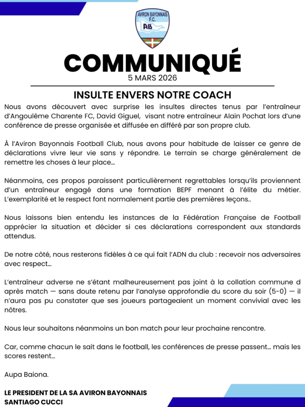 Avant de poursuivre : « À l’Aviron Bayonnais Football Club, nous avons pour habitude de laisser ce genre de déclarations vivre leur vie sans y répondre. Le terrain se charge généralement de remettre les choses à leur place… Néanmoins, ces propos paraissent particulièrement regrettables lorsqu’ils proviennent d’un entraîneur engagé dans une formation BEPF menant à l’élite du métier. L’exemplarité et le respect font normalement partie des premières leçons…