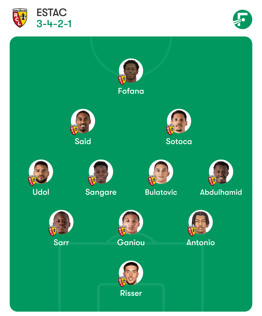 RC LENS (3-4-2-1) : Risser – Antonio, Ganiou, Sarr – Abdulhamid, Bulatovic, Sangaré, Udol – Sotoca (c.), Fofana, Saïd